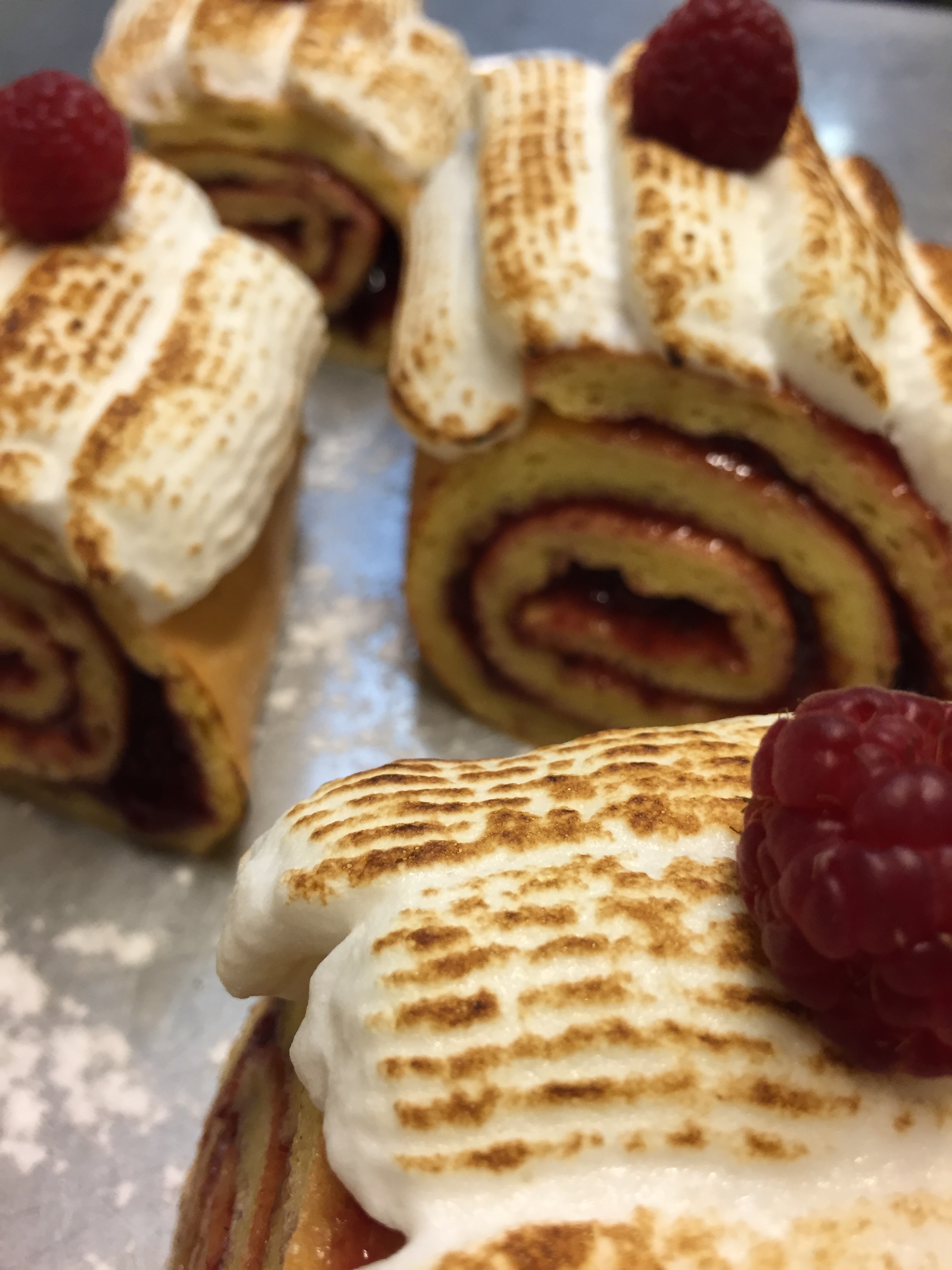 Décorez avec une poche à douille vos biscuits et flambez-les avec un chalumeau en faisant attention. Décorez avec des framboises fraîches