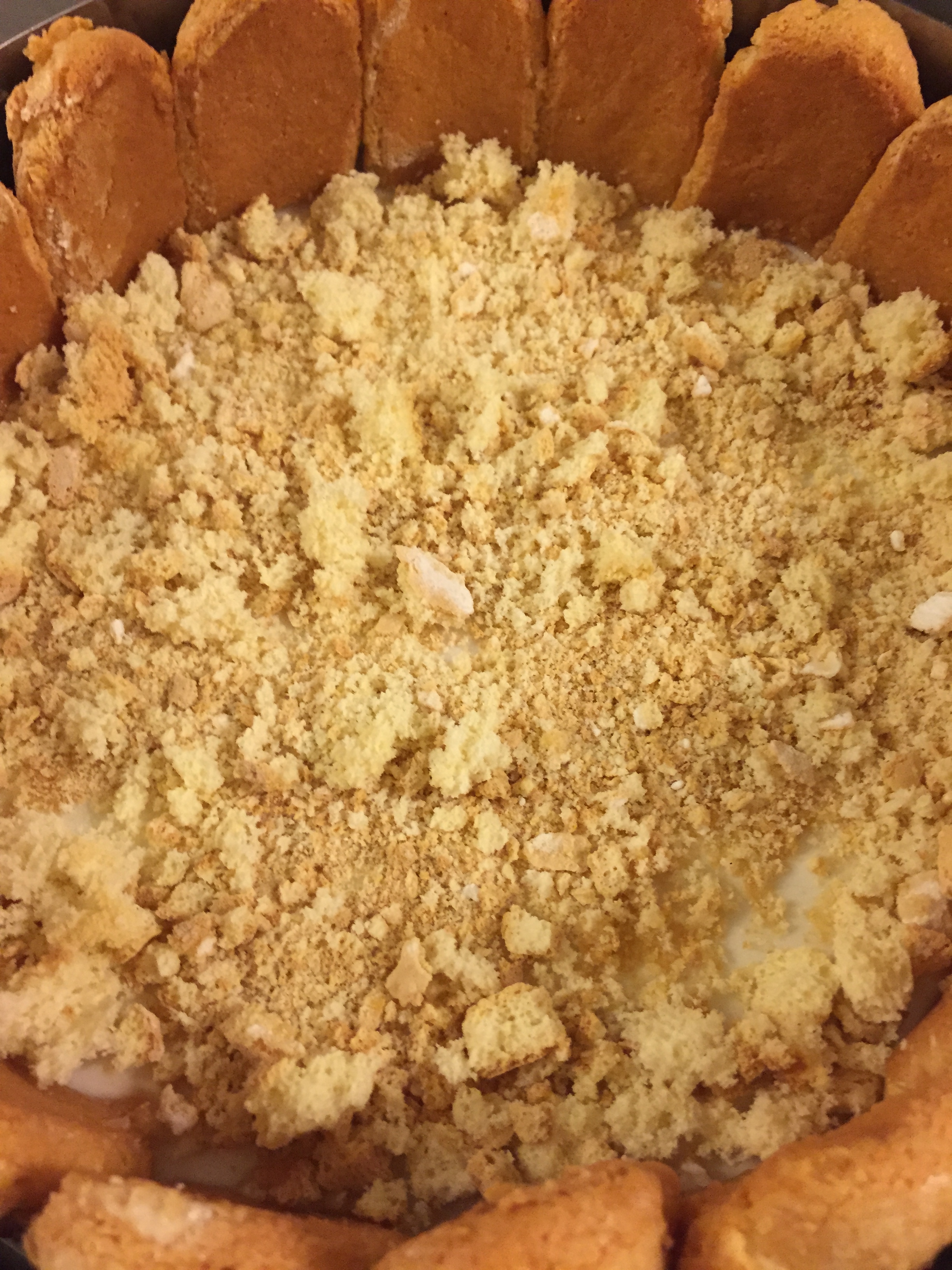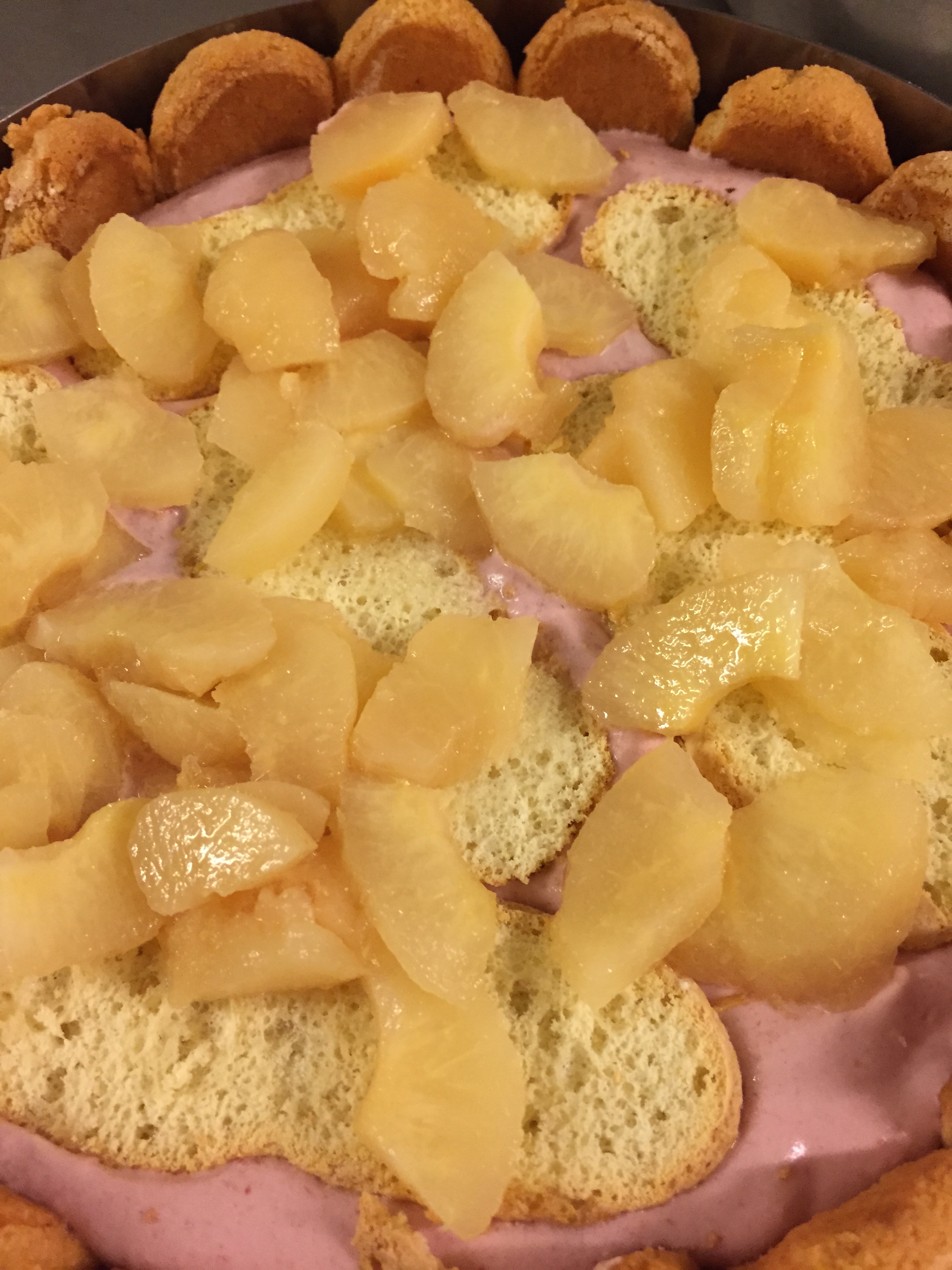 Entourez de biscuits cuillères, imbiber avec le sirop de poire votre moule et émiettez au fond des biscuits cuillères non imbibés et des poires coupées en petit morceaux