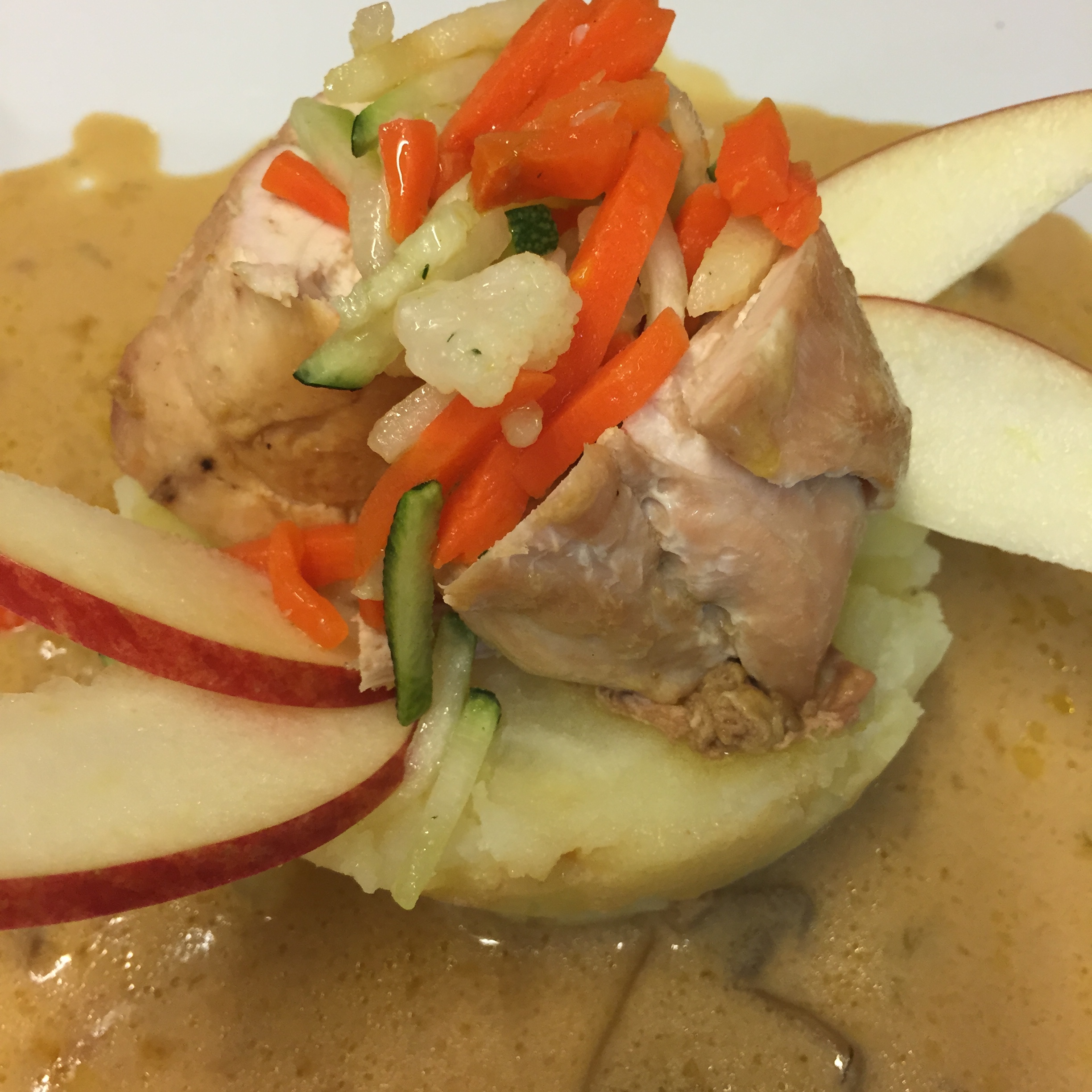 Dressez la purée sur l’assiette avec un petit fond de veau pas trop épais autour et coupez en tranche votre poulet pour le mettre sur la purée. Décorez suivant votre goût.