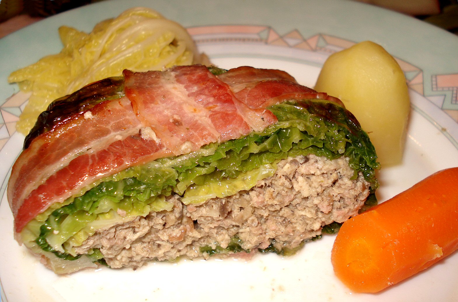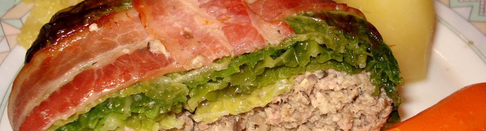 Étalez de la farce sur le chou, de nouveau du chou, puis de la farce. Faites ainsi des couches successives en terminant par le chou. Recouvrez de carottes et des tranches de poitrine. Arrosez d’un bouillon de bœuf, ouvrez la cocotte et enfournez pour 1 h à 200 °C.