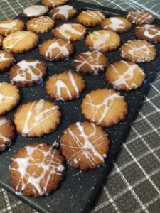 Préparez le glaçage en mélangeant un demi-blanc d’œuf avec le sucre glace jusqu’à l’obtention d’un mélange épais et brillant. Nappez-en les biscuits avec un pinceau ou une poche à douille