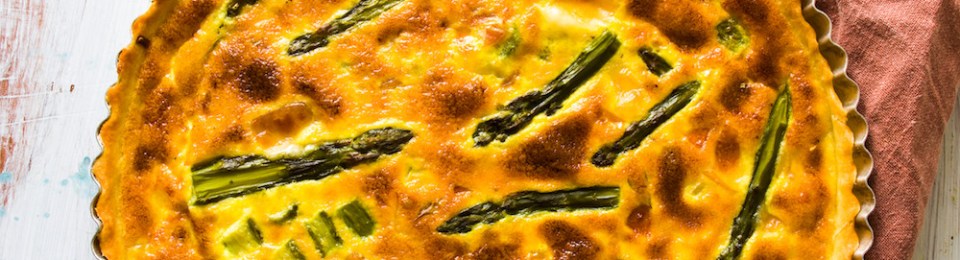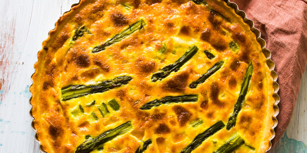- Garnir un moule à tarte d’une pâte brisée ou feuilletée , badigeonner le fond de moutarde, disposer les morceaux d’asperges vertes puis verser l’appareil précédent.