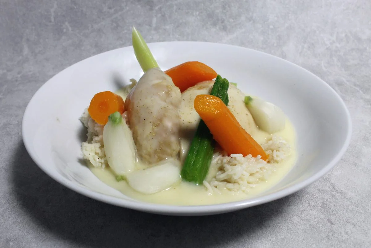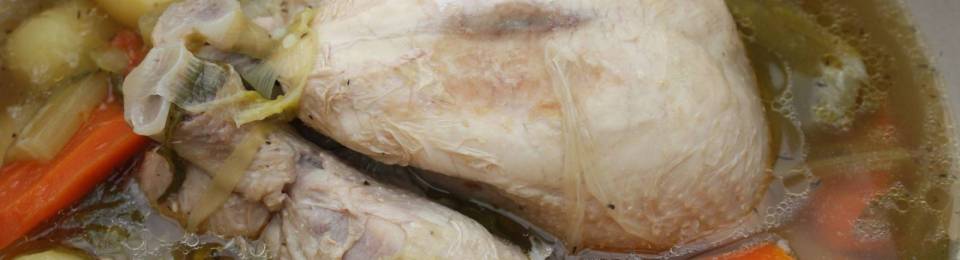 à base de pot-au-feu ou potée de poule cuite au bouillon, dans une cocotte, avec des légumes (carottes, navets, poireaux, oignons, clous de girofle…).