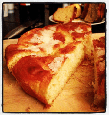 2. Ajoutez la farine, les œufs et le beurre fondu. Lancez le programme pâte seule. (Si vous n’avez pas de machine à pain, pétrissez la pâte au robot ou à la main. Laissez lever la pâte 45 min dans un endroit tiède).