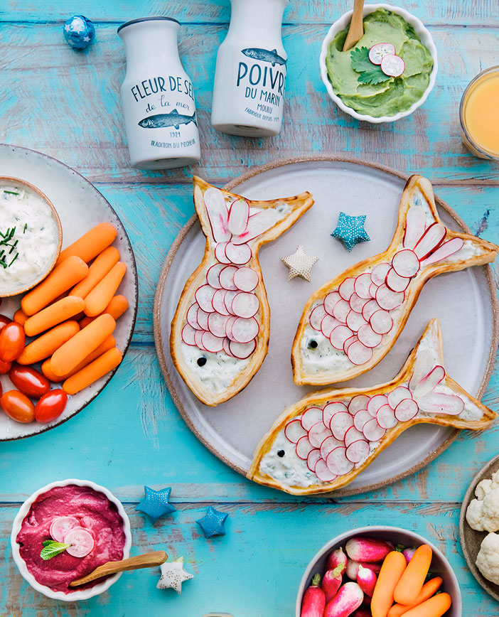 À l’aide d’un emporte-Pièce ou à la main levée, découper 4 poissons dans la pâte feuilletée.