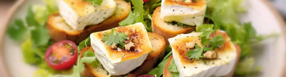 - Disposez la salade sur les assiettes et placez une tranche de pain au chèvre chaud sur chaque portion.