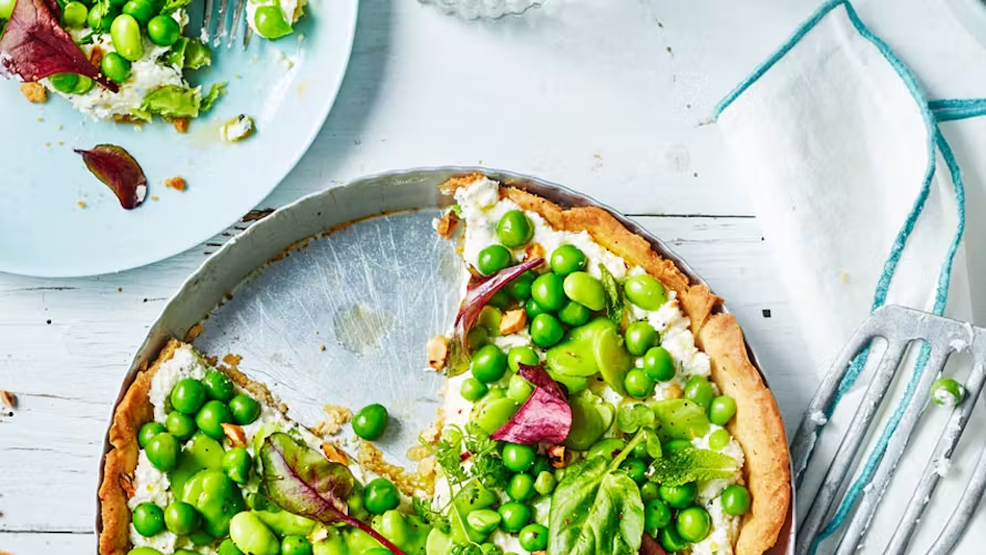- Beurrez et farinez un moule. Déposez au fond la seconde pâte brisée. Garnissez avec votre appareil à base de petits pois. Arrosez l’ensemble d’un filet d’huile d’olive. Décorez le pourtour de votre tourte de fleurs de pâte brisée. Séparez le jaune d’un blanc d’œuf et dorez vos fleurs. Enfournez à 180 ° C (th 6) pendant 40 min.