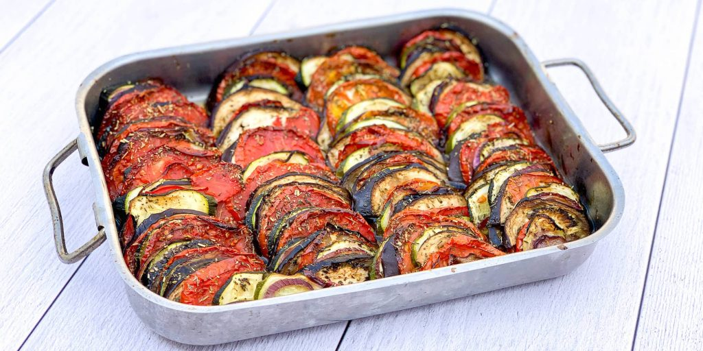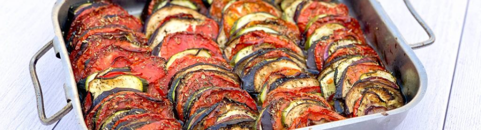 Dans un plat à gratin, disposez les légumes dans cet ordre : une tranche d’aubergine, de tomate, de courgette puis d’oignon rouge. Répétez l’opération jusqu’à remplir entièrement le plat. Ensuite, arrosez les légumes d’huile d’olive, râpez une gousse d’ail (ou ajoutez de l’ail semoule), ainsi que des herbes de Provence, du sel et du poivre. Enfournez environ 1h15. Au bout de 30 minutes de cuisson, arrosez légèrement les légumes avec un peu d’eau.