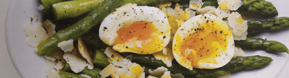 - Assembler la salade : Disposez les asperges sur une assiette, ajoutez l’œuf mollet coupé en deux et parsemez de copeaux de parmesan. Ajoutez un peu de roquette si vous le souhaitez et drapez avec la vinaigrette.