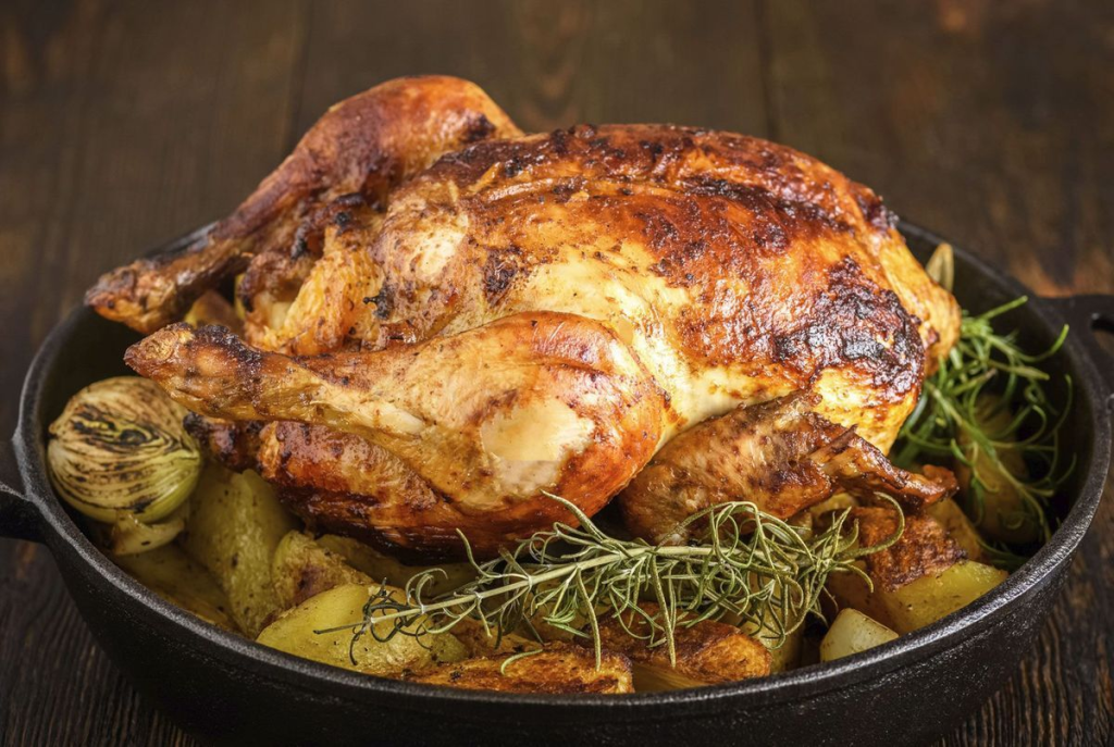 - Rôtissez le poulet : Mettez le plat au four et laissez cuire pendant 1h15 à 1h30, jusqu’à ce que le poulet soit bien doré et que la température interne atteigne 75°C (165°F). Arrosez le poulet de temps en temps avec son jus.
