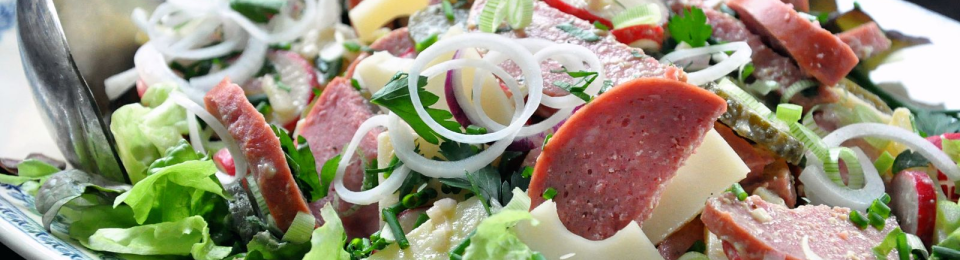 - Dans un grand saladier, mélangez la salade verte, les pommes de terre, les haricots verts, le cervelas, l’oignon, les cornichons et les tomates.