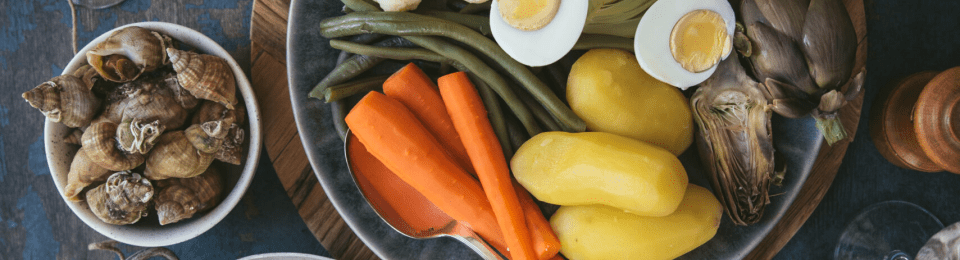 - Dans un grand plat de service ou dans plusieurs plats, disposez le poisson, les légumes encore tièdes, les œufs écalés, les crevettes et les bulots.