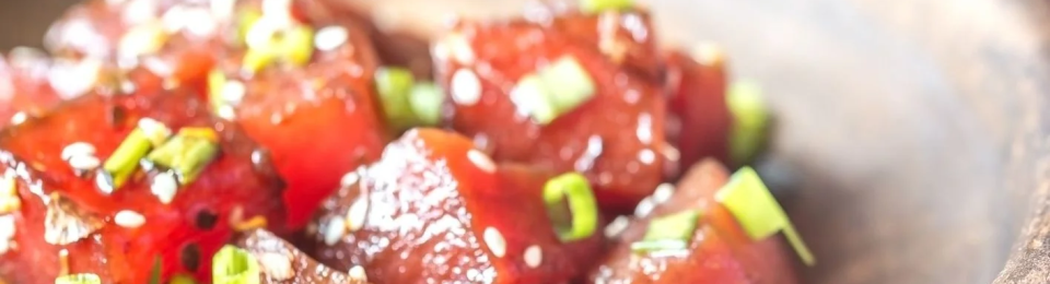 - Dans un grand bol, mélangez le thon rouge coupé en dés avec l’oignon vert, la tomate et le concombre.