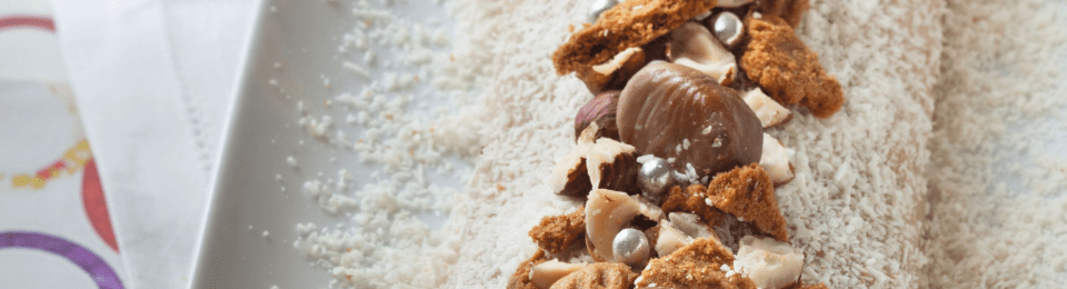 - Décorez le dessus avec un peu de crème au marron, des marrons glacés et saupoudrez de cacao ou de sucre glace, ou poudre de coco moi J’aime bien.