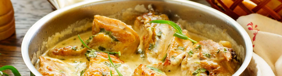 Une fois le poulet cuit, retirez à nouveau les morceaux de la poêle. Ajoutez la crème et mélangez bien pendant que la sauce mijote encore quelques minutes pour s’épaissir. - Servir :