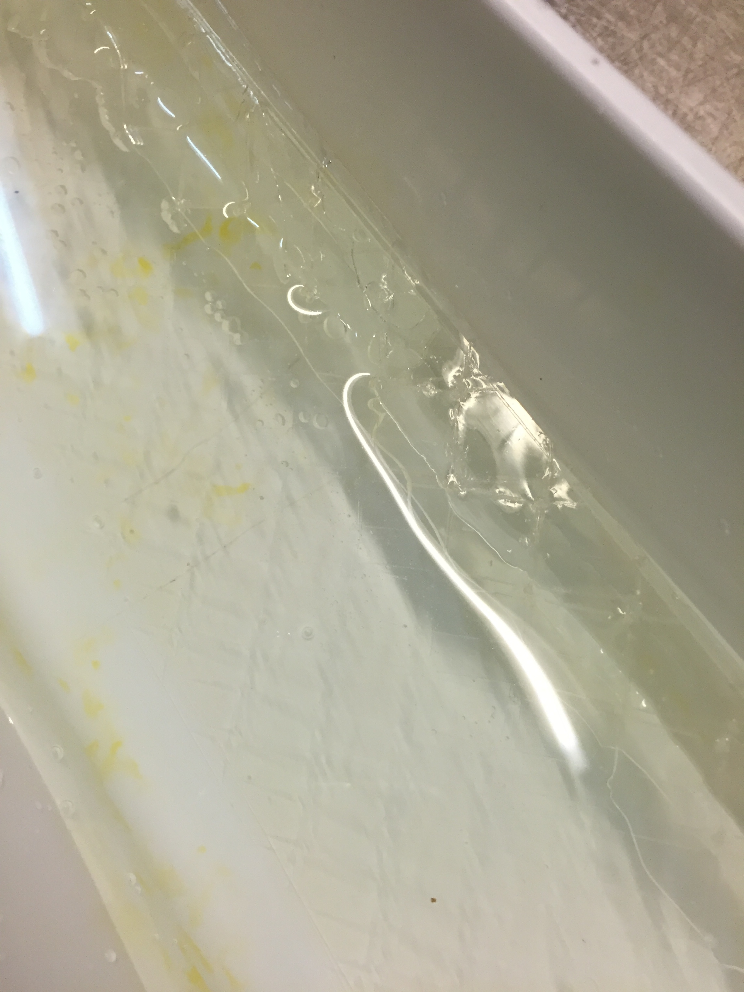 Attention, pas très longtemps, le chocolat ne doit pas être bouillant et mettez les feuilles de gélatines dans l’eau froide