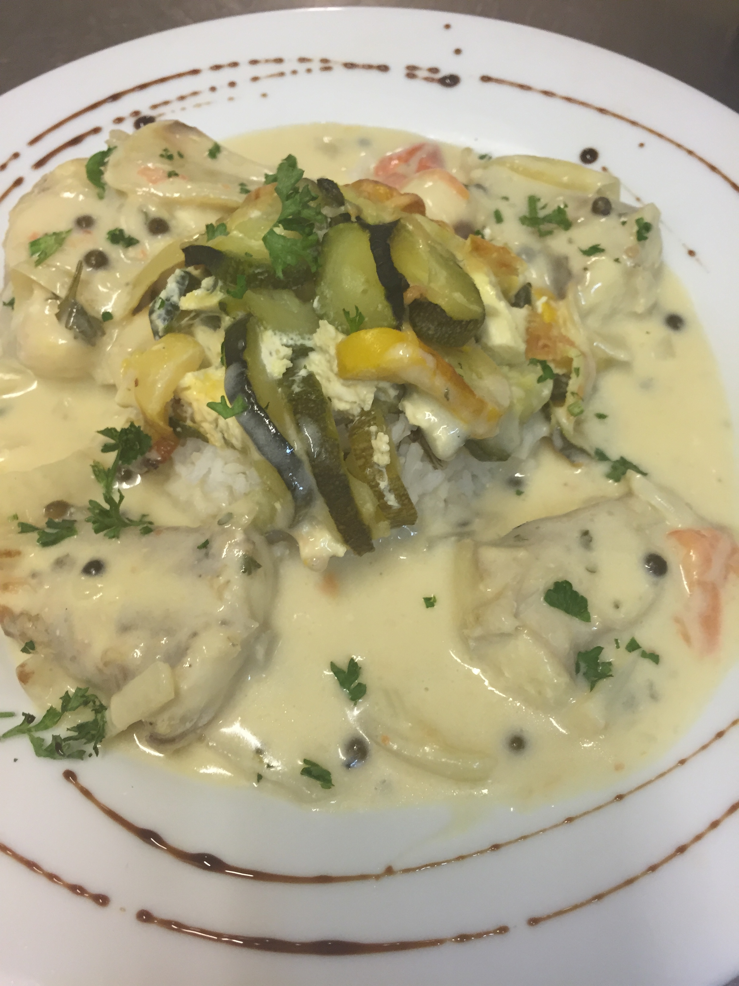 S’il le faut, vous pouvez lier la sauce avec toujours ma fameuse technique, farine avec un peu d’eau froide diluée dans un bol. Dans ce cas, laissez bouillir un peu pour cuire la farine, vérifiez de nouveau l’assaisonnement et remettez vos morceaux de lotte dans la sauce.